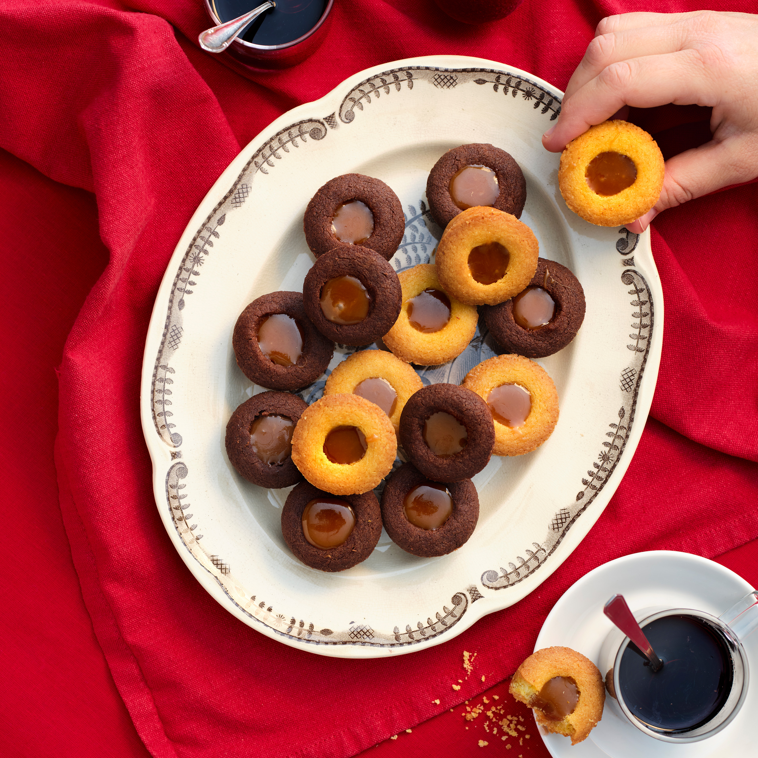 Arbeta samman ingredienserna till degen. Rulla 30 lika stora kulor som läggs i småkaksformar. Gör en fördjupning i varje kaka. Skålla, skala och hacka mandeln. Blanda samtliga ingredienser till fyllningen i en kastrull och koka upp. Fördela fyllningen i fördjupningarna på kakorna. Grädda mitt i ugnen i 200 °C i cirka 12 minuter. Låt svalna på galler.